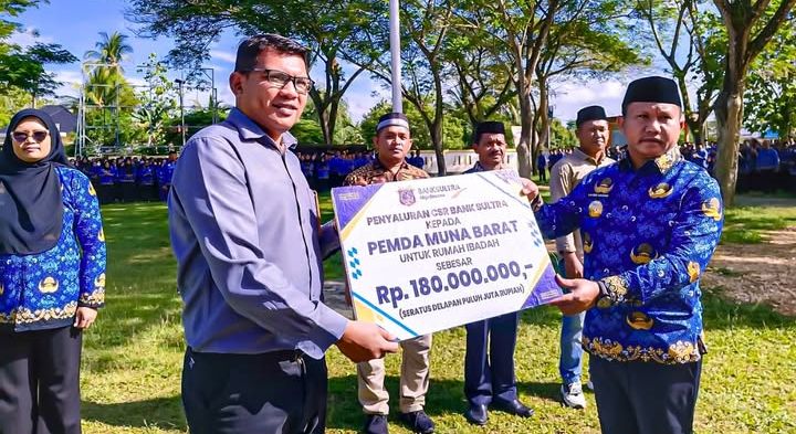 Bertempat di lapangan Kantor Bupati Muna Barat pada Senin, 17 November 2025, bertepatan dengan upacara Hari Kesadaran Nasional, Bank Sultra secara simbolis kembali menyerahkan bantuan CSR untuk rumah-rumah ibadah sebesar Rp 180.000.000 yang diterima langsung oleh Bupati Muna Barat La Ode Darwin.